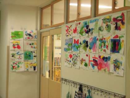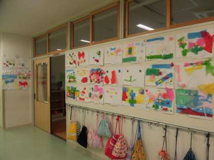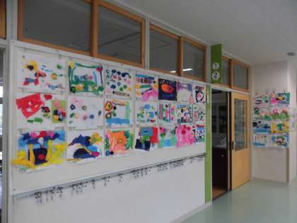 1年生の廊下には図画工作の時間に作った「さわって はって たしかめて」の作品が掲示されています。花紙をねじったり、丸めたりしながら、色とりどりに仕上げられています。