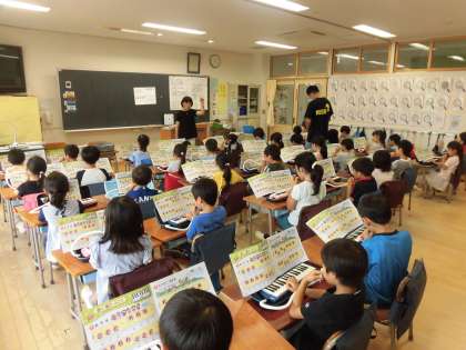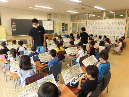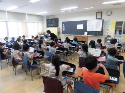 2日(火)の3時間目、1年4組は音楽の時間でした。「さんぽ」などの歌をうたったあと、鍵盤ハーモニカの練習をしました。今回は、ドとレの音で「たこたこあがれ」の曲を吹きました。音楽の先生、担任の先生、包括支援員の3名で子どもたちの指使いを確認し、最後はみんなで合わせました。