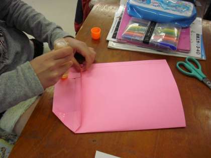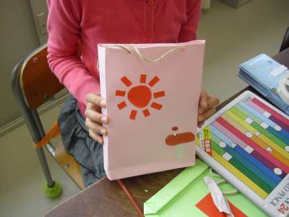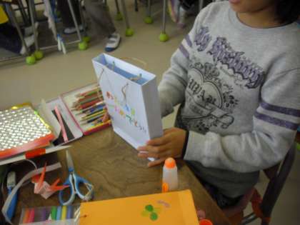 3年生の図工の授業の様子です。「まちつきのふくろ」づくりに取り組んでいるところです。色画用紙を織り込んで、模様等を付けてできる手軽な袋です。小物を入れるのにちょうどよい大きさです。2時間で完成しました。