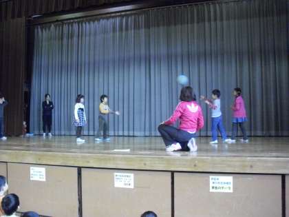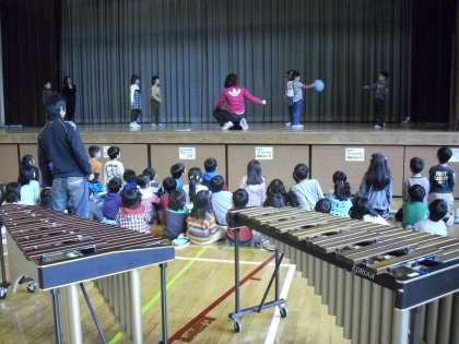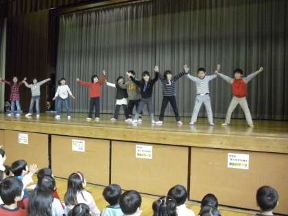 1年生の入学式に向けた練習の様子です。4月に2年生になる1年生。自分たちの後輩に当たる新しい1年生の入学式で、歓迎の演技を披露します。1年間の学校生活でこんなにたくさんの楽しいこと、できるようになったことを紹介し、演技や音楽で歓迎する予定で、がんばっているところです。