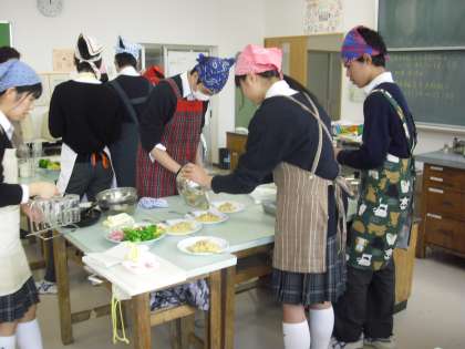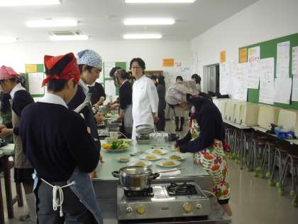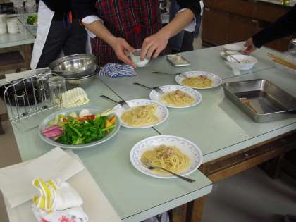 中学3年生の総合的な学習の時間の授業の様子です。小学校の家庭科室でイタリアン料理のシェフを講師に招き、スパゲティ・カルボナーラづくりに挑戦です。シェフの指導だけあって、作り方も本格的です。クリームのよい香りが広がっていました。