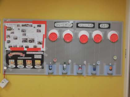 7月になり、給食室前の掲示物が変わりました。暑さに伴い飲む機会の多い清涼飲料水を取り上げています。滑車式で容器が持ち上がり、飲み物に含まれている糖分の量を表示しています。ご来校の際は、ぜひご覧ください。