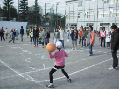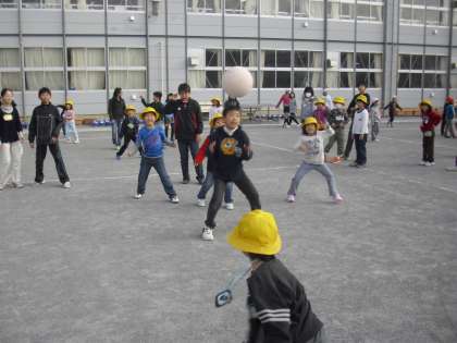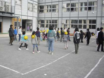 今朝の学級遊び「みんなでたのしく」の様子です。学級遊びですが、1年生と6年生は校庭で仲良くドッジボールをして遊んでいます。1年間のかかわりによって築かれ、成長した人間関係。本当に楽しそうです。