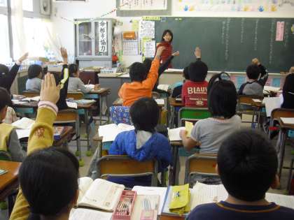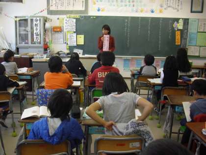 3年生の国語の授業の様子です。単元「おにたのぼうし」の学習に取り組んでいるところです。初発の感想等、ノートに記述した内容を発表しています。友達の感じ方を知ることで読み深めていきます。