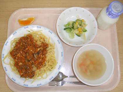 今日は子どもたちに大人気のメニューである「スパゲッティミートソース」でした。ミートソースには細かく刻んだ大豆が入っています。豆が苦手な方でも食べやすい献立になっています。