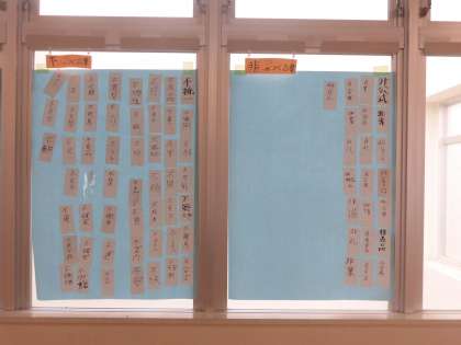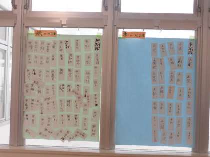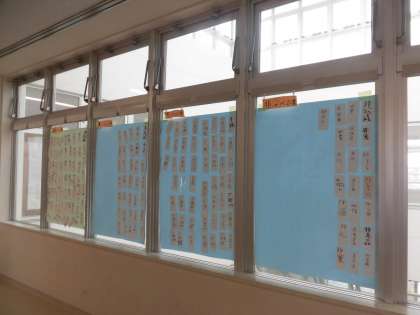 5年生の廊下には、国語の時間に取り組んだ「言葉の構成」が掲示されています。言葉の組み合わせを考える中で、下の言葉を打ち消している「非」「不」「未」「無」のつく言葉探しをしました。ガラス一面の模造紙に小さな短冊がたくさん貼られています。