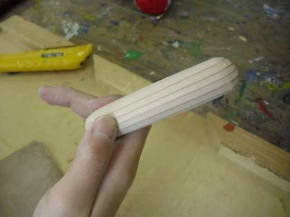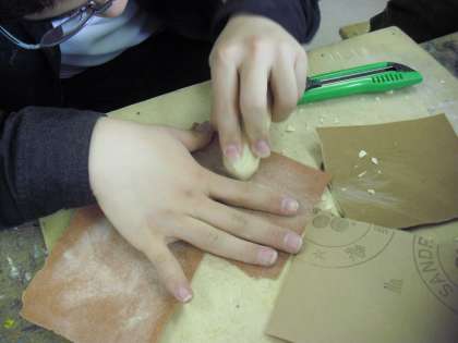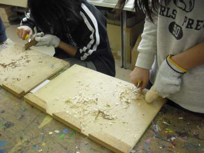 6年生の図工の授業の様子です。木工作品「けずって みがいて いいかたち」の制作に取り組んでいるところです。削っている段階の人、鑢で磨いている段階の人と様々ですが、一生懸命に自分の作品と向き合っています。