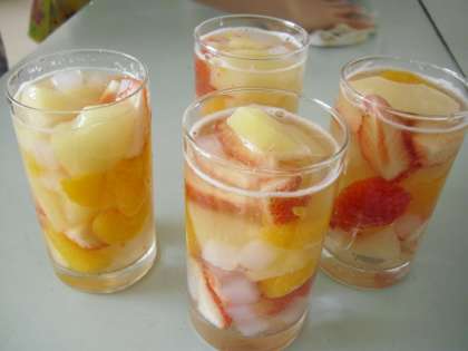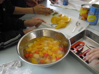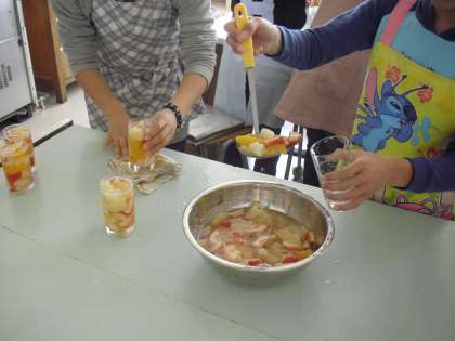 カットしたフルーツをボールに入れ、ソーダ水を入れます。軽くかき混ぜて、コップに盛り付けます。カラフルなフルーツポンチの出来上がりです。子どもたちもおいしそうに食べていました。