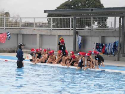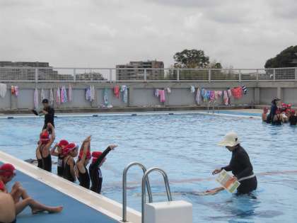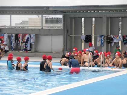 17日(水)の3・4時間目、1年生は体育の学習でプールに入りました。1学期最後のプールということから、クラスごとに検定をしました。顔を水につけたり、けのびで進んだりしていました。