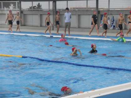 29日(月)、朝から太陽が照りつけ、5・6年生の水泳教室が始まりました。今回は、距離を泳ぐ検定日でもあります。コースロープで区切り、検定に臨む人と練習をする人に分かれました。