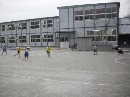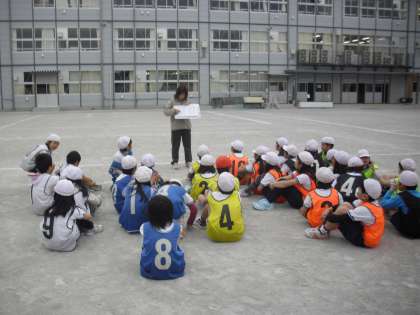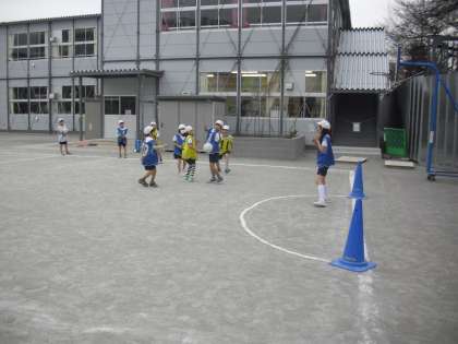 3年生の体育の授業の様子です。クラスごとにコートやゴールの大きさやルール等が少しずつ異なります。ゲーム領域では、ルール作りも大事な学習内容です。自分たちの考えた工夫でゲームを楽しみます。