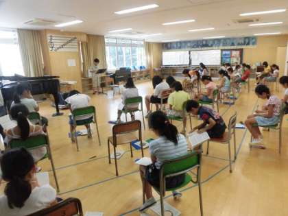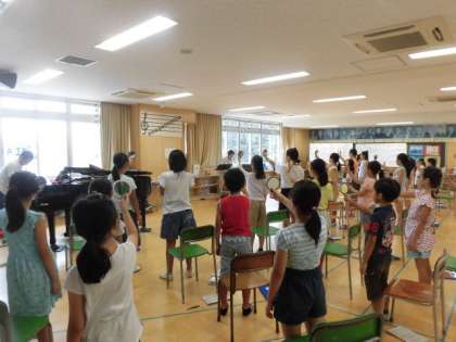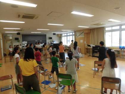 8月1日(木)、午前8時から合唱団の練習がありました。鏡を見ながら自分の口の開け方をチェックしたり、録音した自分たちの歌声を聞いて改善点を話したりしました。午前11時までの3時間、水分補給をしながら練習をしました。