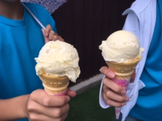 高徳牧場でアイスクリームを食べました。みんな「めっちゃうまい!」と言いながら、濃厚な味を堪能していました。