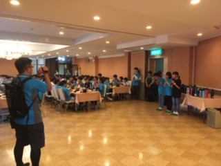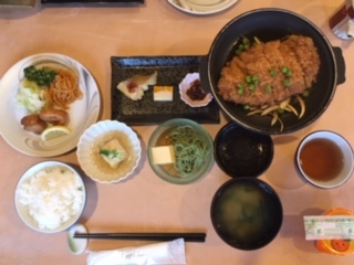 夕食。宿舎での最初の食事です。食堂も広々としています。カツ煮が美味しそうです。いただきます。