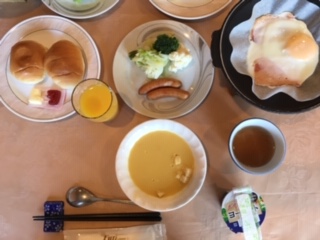 朝食です。しっかり食べて、今日の活動に備えます。いただきます。