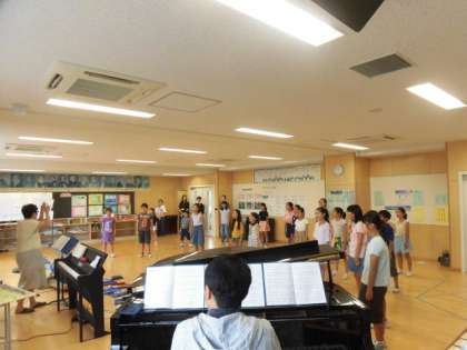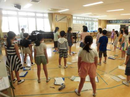 8月3日(土)と4日(日)、午前8時15分から合唱団の練習がありました。5日(月)に開催される「TBSこども音楽コンクール東京地区大会」に出場するためです。6年生が日光林間学園で不在の中、5年生を中心に4年生も3年生も頑張ってきました。「青い竜」の歌を歌い込めば込むほど、音程の確かさや言葉の伝わり方にまで子どもたちの意識が届くようになってきています。写真は4日の様子です。合唱団の保護者の皆様にも連日子どもたちの練習のサポートをしていただいています。いつもありがとうございます。