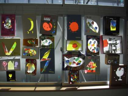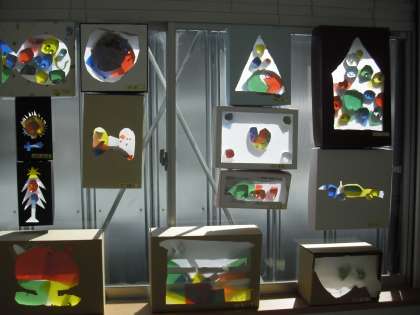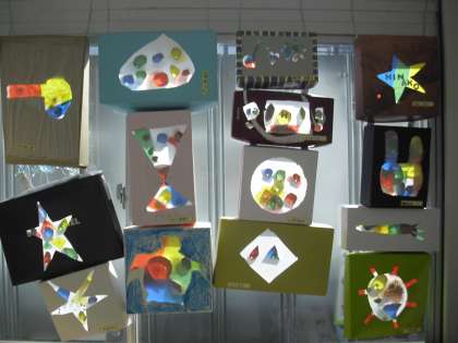 3年生の教室前の廊下の窓に展示してある作品「光と色のファンタジー」です。ちょうど朝日を浴びて、作品に光が降り注いでいます。色のセロファンやビー玉がきれいに光っています。