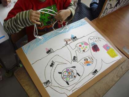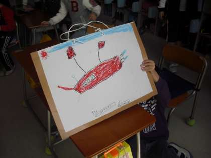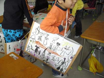 1年生の教室の様子です。手に持っているのは「図工作品バック」です。1年間の作品を整理してきれいに持ち帰るために作ったバックです。バックにも好きな絵を描きました。作品の入ったバックを嬉しそうに抱えています。