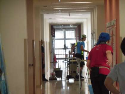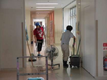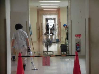 8月5日(月)から、主事さん方による廊下のワックスがけが始まりました。毎年、人数が少なくなるこの時期に実施しています。廊下の他に、階段、トイレにもワックスをかけます。4階から行っていきます。