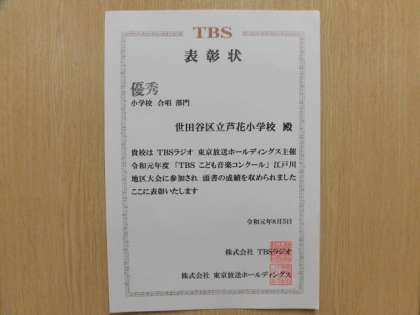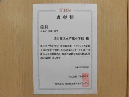 5日(月)、江戸川区総合文化センターにおいて「第67期TBSこども音楽コンクール東京都・江戸川地区大会」が開催されました。本校の合唱団は、重唱の部と合唱の部の2部門に参加しました。重唱の部では優良賞を、合唱の部では優秀賞を受賞しました。3年生から6年生までの子どもたちが努力を重ねてきた結果です。また、子どもたちの練習のために保護者の皆様が見守ってくださったり、コンクールの引率を手伝ってくださったりしたお陰です。心より感謝申し上げます。