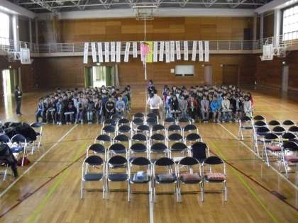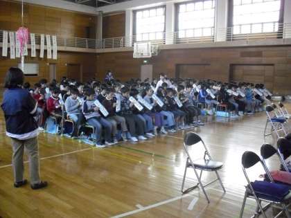 5・6年生による2回目の卒業式合同練習の様子です。今日は音楽を中心とした練習です。5年生が「カノン」を鍵盤ハーモニカとリコーダーで演奏します。6年生はじっと5年生を見つめながら聴いていました。
