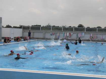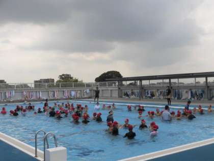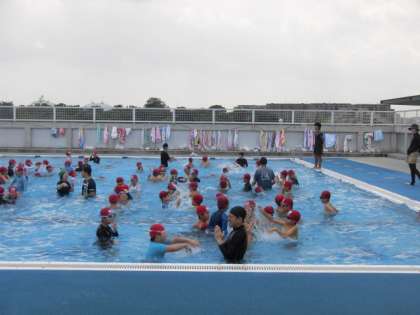 26日(月)、夏季水泳教室の最後は3・4年生でした。時折、太陽が顔を出し、子どもたちも元気に水の中に入りました。水慣れでは、お地蔵さんごっこをしたり、文字数で仲間を作ったりして楽しく過ごしました。