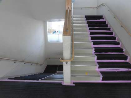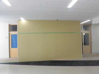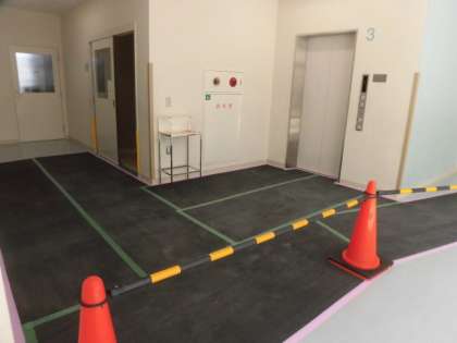給食室改修工事の他に、校内で工事が行われています。「第二図工室(仮称)」です。これまで3階の教材室と作品置き場だったところを一緒にして教室を作っています。子どもたちの安全を最優先にして工事を進めていきます。また、植物階段は、工事関係者が通るための道として、黒いビニールシートを敷いています。子どもたちも歩くことができます。