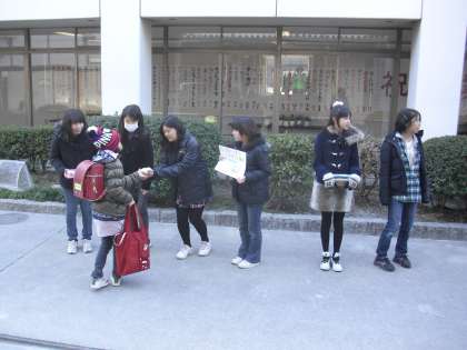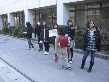 6年生が、今回の大震災に対し、義援金の募金活動を行っている今朝の様子です。6年生が自主的に、今、自分たちにできることは何かを考え、担任を通して渡部校長の許可をもらい活動が始まりました。お知らせのチラシやポスターも作成し、校内に掲示したり、お昼の校内放送で呼びかけたりしています。学校では節電活動も行っています。