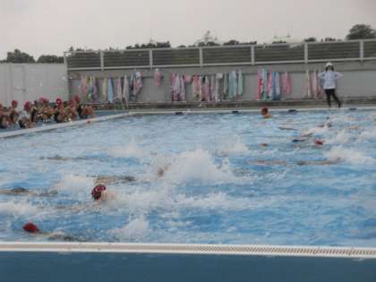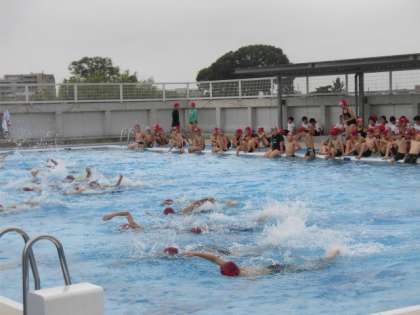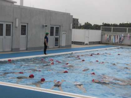3日(火)の1・2時間目、5年生は体育の時間でプールに入りました。水慣れとして大の字になって浮いたり、けのび競争をしたりしました。その後、クロールと平泳ぎの練習をしました。