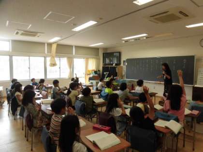 4日(水)の3時間目、2年1組は国語の時間でした。詩「雨のうた」を読みました。水の跳ね返る音をみんなで考えていました。黒板いっぱいに音の表現がみつかりました。
