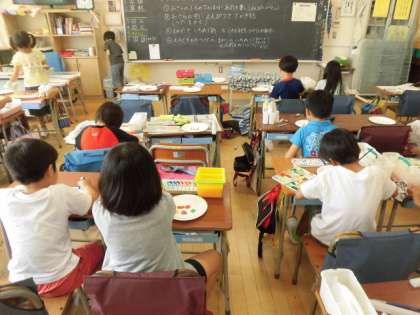 4日(水)の3・4時間目、2年4組は図画工作の時間でした。「ごちそうミニトマト」と題して、紙皿に絵を描きました。トマトのツヤを白い絵の具で表したり、トマトの色を少しずつ変えたりしながら完成させました。