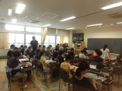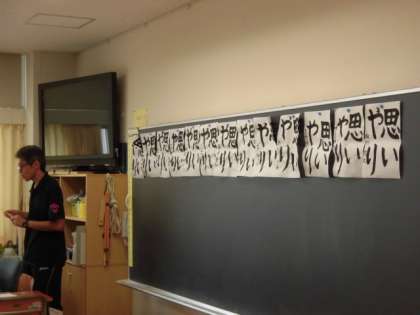5日(木)の1・2時間目、5年4組は書写の学習で習字をしました。「思いやり」と書きました。清書ができた人は、黒板に掲示しました。