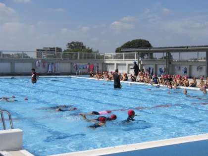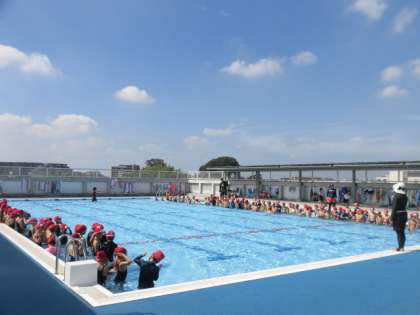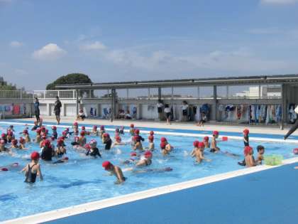 6日(金)の1・2時間目、1年生は体育の学習で水遊びをしました。水慣れのあと、「けのび」の練習をしました。子どもたちはプールの壁を蹴って、ぐーんと前に進めるようになりました。その後、赤組と白組に分かれて「宝探し」をしました。子どもたちは大喜びでした。