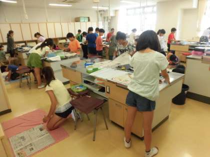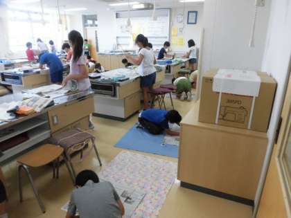 6日(金)の1・2時間目、5年3組は家庭科の時間でした。「オリジナルクッション」製作のために、新聞紙で作った型紙を布に当ててチャコで印をつけていました。わからないところは先生や友達に聞いて活動を進めていました。