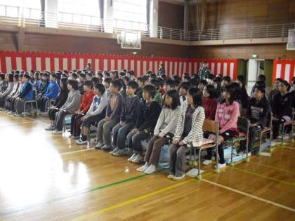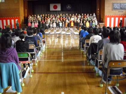卒業生・在校生による呼びかけの様子です。卒業生は自席から舞台へ移動し並びます。呼びかけの始まります。5年生は引き続き、出番まで姿勢を崩さずに待っていました。