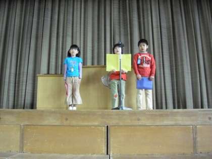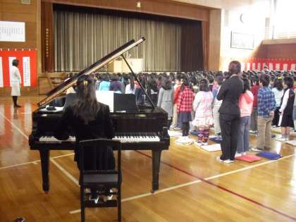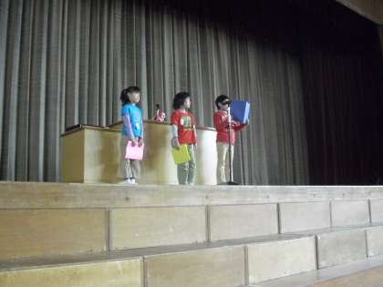 児童代表の言葉は1年生。各クラスの代表児童が、1年間の成長について発表しました。3人とも堂々としていてすばらしかったです。6年生にお世話になったことにも触れていました。最後は、みんなで校歌を歌いました。