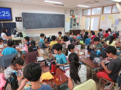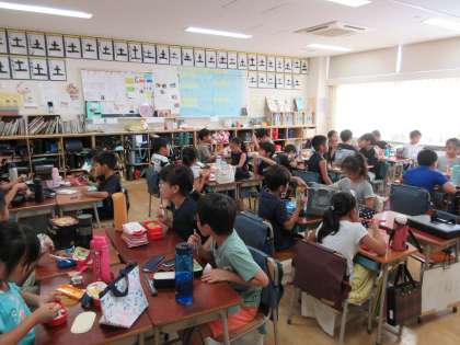 お弁当持参期間も12日(木)で8日目です。40日ある中の5分の1が経過したことになります。保護者の皆様、毎日のお弁当作りを本当にありがとうございます。写真は上から、1年生、2年生、3年生の様子です。お弁当バッグを学校に置いたまま下校する人がいますので、担任の他に学童や新BOPでも声掛けをしています。