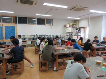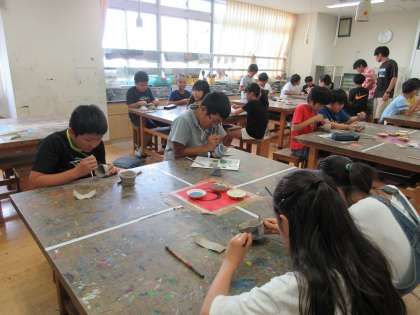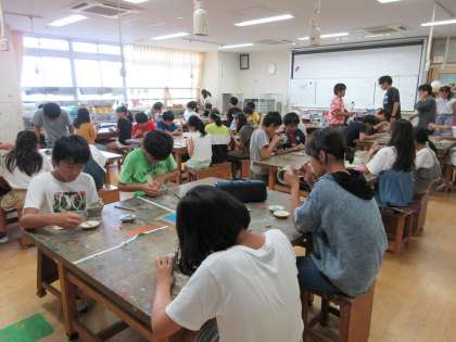 12日(木)の5・6時間目、6年4組は図画工作の時間でした。「マイマグカップ」と題して、1学期に形を作って乾かしておいたカップに、やすりをかけたり、彩色をしたりしていました。