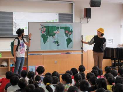 14日(土)の4時間目、1年生は合同で道徳の時間でした。第二音楽室で行いました。ゲストテーチャーをお招きして、「旅人みちるさん」の海外お土産話を伺いました。子どもたちは、世界にはいろいろな人がいて、いろいろな文化があることに気付きました。「みんなちがって、みんないい」という心をもつこともできました。