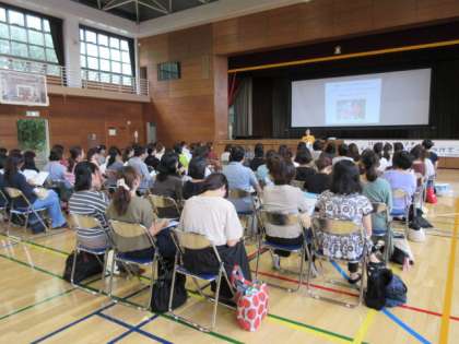 14:15から、都合により中学校体育館に場所を変更して行われました。9月下旬に行う、3年生の「地域安全マップ」作りのためのフィールドワークに、同行していただく保護者の方、一人一役の方など、多くの方にご参加いただきました。子どもたちの視点はどこにあるのか、何が手伝えるのか、安全管理は・・・と、当日の心構えを含めて、いろいろと教えていただきました。