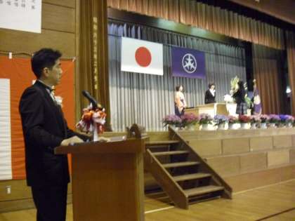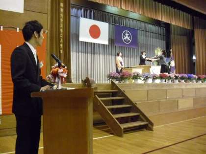 卒業証書授与の様子です。担任から名前を呼ばれると、力強く返事をし、自分の将来の夢を伝えます。渡部校長から卒業証書をしっかりと受け取る卒業生。その様子をじっと見守る担任。信頼が伝わってきます。