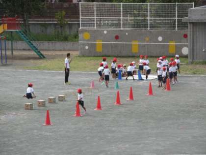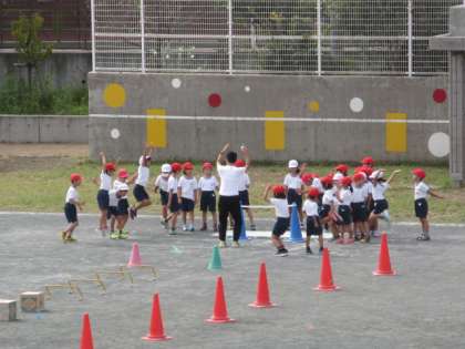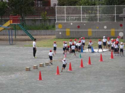 18日(水)の1時間目、2年2組は体育の時間でした。校庭でとびこしあそびをしていました。ジグザグコースを走ったり、ミニハードルを飛び越えたりして、最後にバーを跳んでいました。