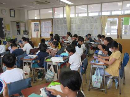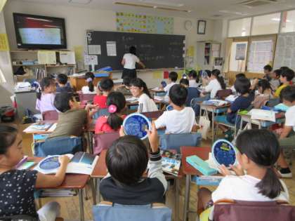 18日(水)の2時間目、4年4組は理科の時間でした。「星の動き」の学習をしていました。星座早見盤を使いながら、夏の大三角形の見える時間帯を探しました。