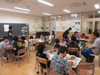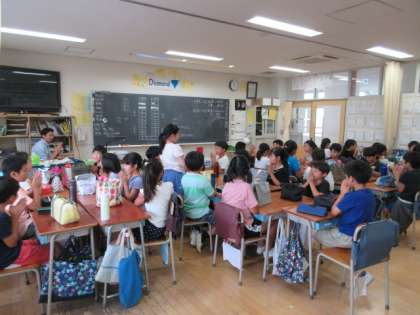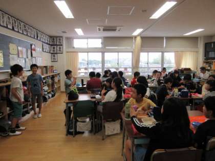 それぞれの学級では、お弁当の時間も楽しく過ごす工夫をしています。グループを替えてより多くの人と話ができるようにしたり、係の人がクイズを出したりしています。ひかり学級では、3・4時間目に調理を行い、ハヤシライスとプルンプルンヨーグルトを作りました。手作りのご飯を「おいしい」と言って食べていました。写真は上から、ひかり学級、4年生、5年生の様子です。