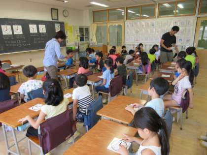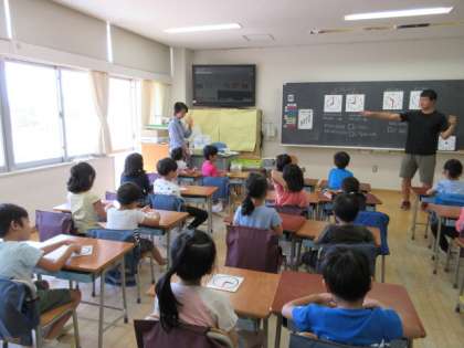 19日(木)の3時間目、1年4組は算数の時間でした。「とけい」の学習をしていました。1人に1台時計を配り、○時に針を動かしたり、○時半の位置にしたりしていました。講師の先生も入って、子どもたちの理解を進めています。