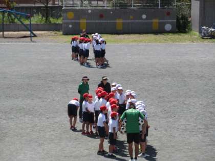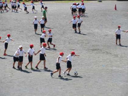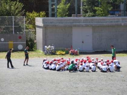 19日(木)の2時間目から4時間目まで、4年生はサッカー教室に参加しました。講師は、東京ヴェルディのコーチお二人です。あいさつ、準備運動をしてから、練習前の話を聞きました。その後、2〜3人で手をつないで、ボールを追いかけました。手をつないだことで互いを気遣うことができました。写真は、3時間目に実施した2組と4組の様子です。