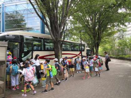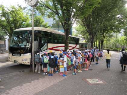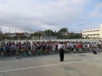 26日(木)は4年生の社会科見学の日です。午前7時50分に校庭に集合して、出発式を行いました。あいさつ、諸連絡をしてから、バスに乗り込みました。バス5台が一度に入らないので、1組、2組、5組が先発で、3組と4組が後発で出発しました。