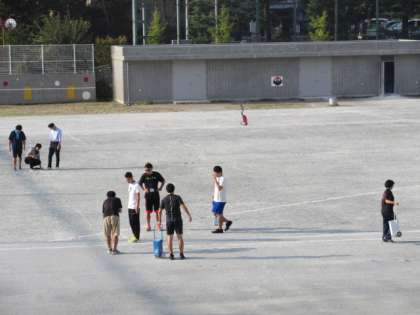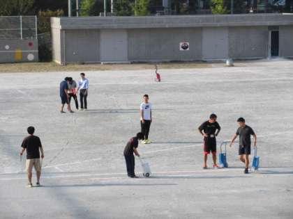 2日(水)午前7時半ごろから、出勤してきた先生達が校庭で作業を始めました。6年生の連合運動会の練習に必要なラインを引くためです。子どもたちがすぐに練習できるようにと学年の先生以外にも手を貸してくれています。