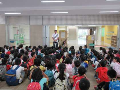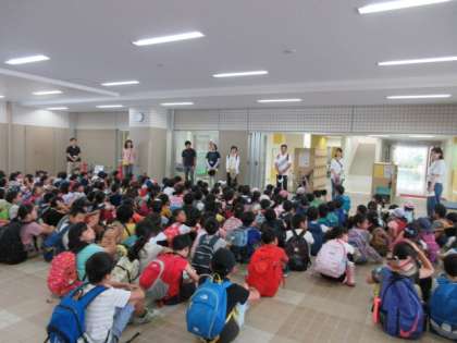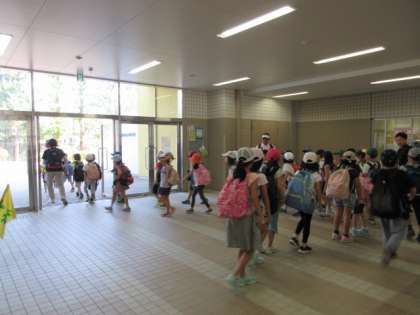 2日(水)、2年生が遠足に出発しました。教室で出席確認や健康観察を済ませてから、1階ピロティに集合しました。担任を含め、13名の教員で子どもたちを引率します。午前8時50分過ぎに元気に歩き出しました。