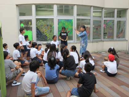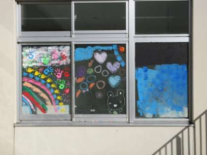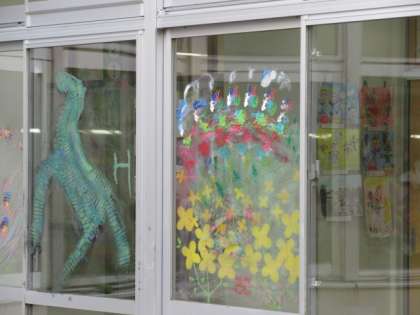 4日(金)の5・6時間目、6年1組は図画工作の時間でした。造形遊びをしましたが、描いた場所は「窓ガラス」でした。「海の広場」に面した窓ガラスに、手やスポンジを使って絵を描きました。後半は友達の作品を見合い、最後に拭き掃除をして終わりました。